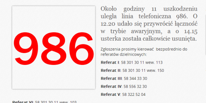 Przez kilka godzin działały linie awaryjne, czyli numery odpowiadające danym referatom. Usterka została szybko usunięta i numer 986 zaczął ponownie działać bez zastrzeżeń.